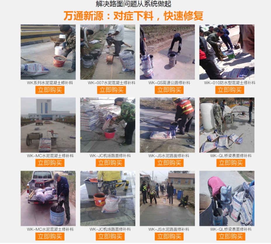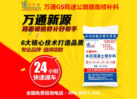 大慶萬通新源科技有限公司獨(dú)有的混凝土路面高強(qiáng)速補(bǔ)料,是水泥混凝土路面病害修復(fù)的好材料。疲勞、凍融循環(huán)、彎曲壓力、滲水和基層破壞等原因都會引起水泥路面的破損,從而帶來高昂的維護(hù)費(fèi)用。與以往的剛性修補(bǔ)方法不同,混凝土水泥路面維修速補(bǔ)膠提供了一種獨(dú)特的柔性修補(bǔ)產(chǎn)品和技術(shù),高柔性、高抗拉性,可跨伸縮縫施工和高抗壓性使得混凝土快補(bǔ)產(chǎn)品為水泥混凝土路面提供了******性的修補(bǔ)。傳統(tǒng)的剛性修補(bǔ)方案,如環(huán)氧砂漿和快干水泥產(chǎn)品,由于其自身的粘結(jié)失效,抗疲勞性低以及與原路面不同的伸縮系數(shù),修補(bǔ)面會在短時間內(nèi)失效或產(chǎn)生新的裂縫,需要反復(fù)修補(bǔ),有效期短且費(fèi)用高昂。大慶萬通新源科技有限公司的混凝土水泥路面維修速補(bǔ)膠可以隨原路面一起伸縮,移動,從而避免了粘結(jié)失效和產(chǎn)生新裂縫。萬通快補(bǔ)產(chǎn)品優(yōu)異的粘結(jié)性、柔韌性和高防滑性,特別適用于水泥路面的淺層粘合修補(bǔ),多邊角混凝土板層修補(bǔ),跨伸縮縫修補(bǔ)以及路面沉陷修補(bǔ)。萬通混凝土病害修補(bǔ)料針對混凝土起皮起沙、斷板裂縫、蜂窩麻面、坑槽露石子、漏筋掉皮、橋梁的掉皮漏筋快速通車使用時間長。應(yīng)用萬通快補(bǔ)產(chǎn)品,施工后一天就可以恢復(fù)交通。大慶萬通新源科技有限公司的萬通水泥路面維修速補(bǔ)膠適用于高速公路、機(jī)場路面、農(nóng)村村村通路面、廠坪、學(xué)校操場、市區(qū)公路、小區(qū)路面、橋梁、水泥路面的修補(bǔ)。使用萬通特快補(bǔ)材料修補(bǔ)路面可以一勞永逸! 水泥地面起砂怎么辦,混凝土修補(bǔ)劑混凝土地面起砂,混凝土地面修補(bǔ),地面起砂怎么辦,